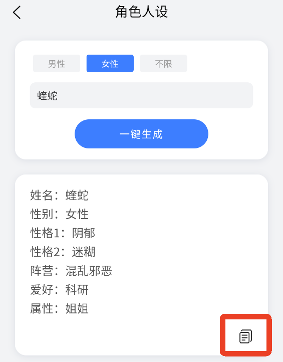 3、下方就会出现性格、阵营、属性等方面的内容,不满意可以再生成一遍。点击右下角可以一键复制。