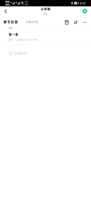 4、书籍是没有章节的我们点击新建章节,列表出现第一章,点击文字进入编辑界面。