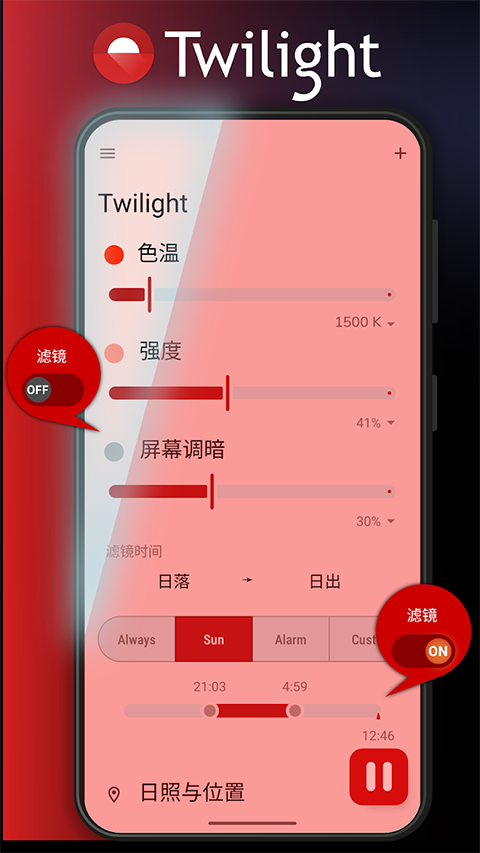 1、提供滤镜功能,保护眼睛; 2、薄暮微光 为睡眠健康保驾护航; 3、可调整色温、滤镜强度、调暗级别、背光控制; 4、可调整过滤时间的各种设置; 5、提供状态栏快速设置; 6、提供桌面小部件。软件亮点