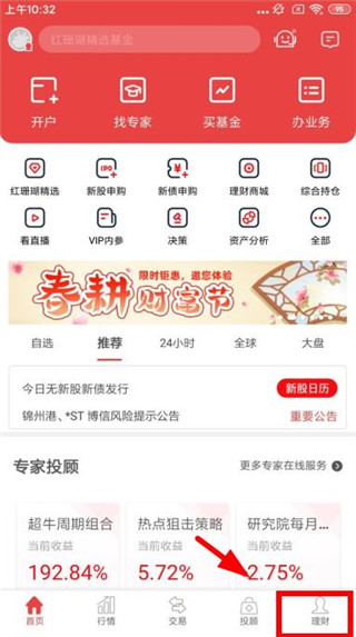 1、下载并安装本站提供的太牛证券app,打开并进入软件界面 2、如下图所示:点击右下角“理财”按钮