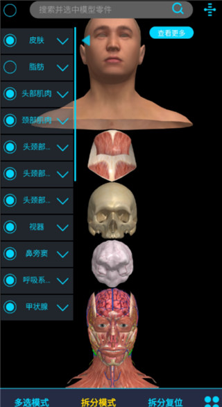 1、【多选模式】点击开启多选模式,点选模型可同时选中多个部分的模型。 2、【拆分模式】点击开启拆分模式,可将选中模型部分拖动单独分离出来进行观察。 3、【拆分归位】将拖动离体的模型一键自动归位。 4、【快速解剖】点击开启快速解剖功能,拖动滑块上下滑动可以实现整组模型由浅到深的快速显隐效果。 5、【搜索框】输入标本部件名称点击搜索按钮可在模型中搜索并选中该标本部分。 6、【透明度】从左至右拖动滑杆可从0%-100%调节选中部分模型的透明度。 7、【取消选择】在空白处点击即可取消对模型的选取状态。 8、【反向选择】选取除选中部分以外的其余模型。 9、【隐藏所选】隐藏选中部分的模型。 10、【隐藏其他】隐藏除选中部分以外的其余模型。软件亮点