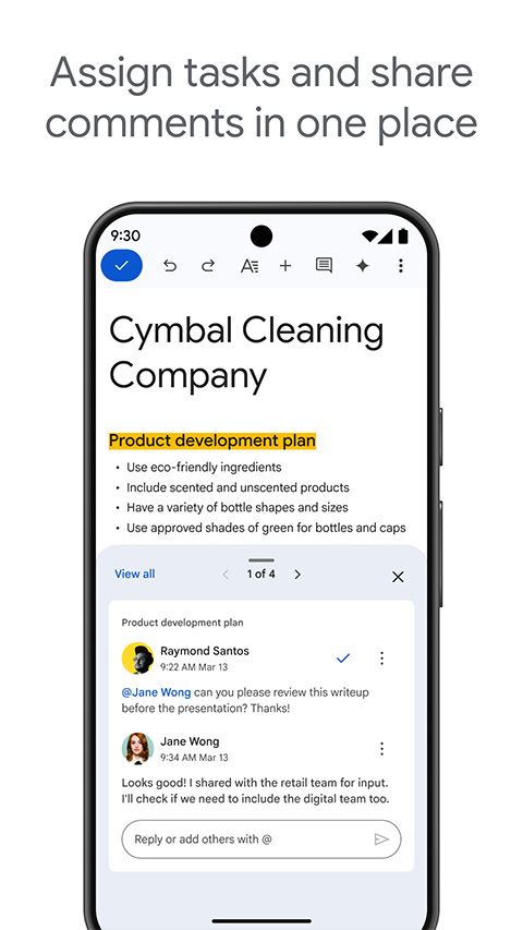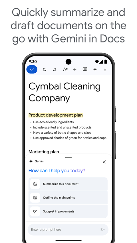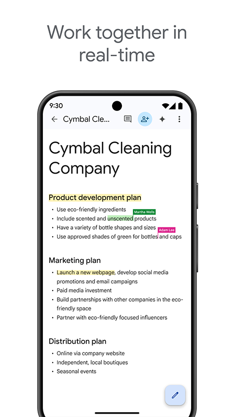 1、为文件添加丰富的元素 提供了智能化的编辑和样式工具,可让您轻松地设置文字和段落的格式,从而制作生动的文档。有数百种字体可供选择,您还可以添加链接、图片和绘图。一切功能完全免费! 2、随时随地任您使用 只要有手机、平板电脑或计算机,您就能随时随地访问、创建和编辑文档,即使没有联网也不受影响。 3、多人协作,效率倍增 在 Google文档上,多人可以同时编辑同一份文档。 4、无需特意保存 系统会在您输入时自动保存所有更改。您甚至可以通过修订历史记录查看同一文档的旧版本,还可以按日期或修改者排序。 5、一切搜索,尽在 Google 文档。 通过 Google 搜索查找图片、引语和文字,汲取灵感,同时无需退出 Android 应用。 6、丰富的插件让您如虎添翼 插件可让您在处理文档时更得心应手。试试用 Avery Label Merge 插件来制作并打印标签和胸牌吧! 7、立即开始使用 Google 文档随时都可以使用。您可直接通过浏览器创建文档,也可以将应用下载到移动设备上使用。软件功能