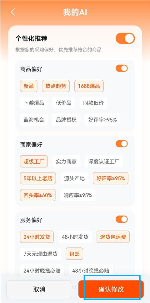 2、用户可选择商品偏好、商家偏好、服务偏好,完成选择后点击确认修改即可。