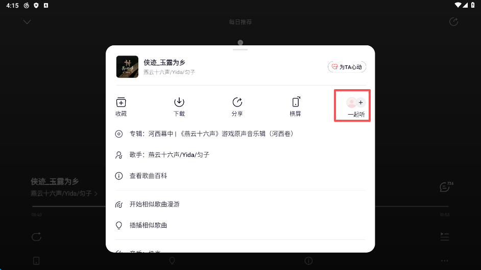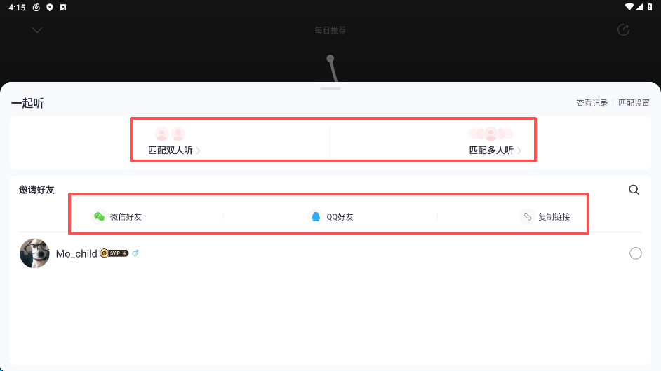 5、可以选择随机匹配一起听或者通过微信,QQ,复制链接三种方式分享给好友,好友点击邀请即可一起听音乐了。