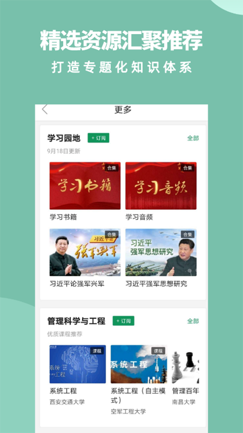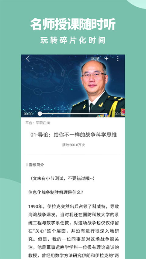 1、汇聚丰富内容教学视频 用户在此可以学习军事、科技、哲学、文学历史等内容的课程; 2、制作个人专属学习清单 用户可以在此管理自己的学习记录以及收藏的课程和学习资源; 3、拥有海量军事教育资源 这里收集了2000万+军事与文学教育资源任你学习; 4、支持智能语音搜索课程 除了手动搜索还能语音输入课程的信息用于搜索课程资源。更新日志