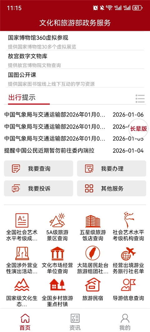 1、我要投诉 12301全国旅游投诉举报平台。 2、我读资讯 政策法规、政策解读等。 3、我要查询 景区查询、酒店查询、社会艺术水平考级机构查询等。文旅政务APP查询考级成绩指南