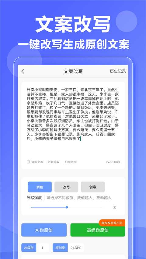 拥有AI写作、改写、扩写、续写、文本纠错等功能的智能软件。无论您需要撰写文章、创作故事,还是寻找灵感和构思,AI写作神器将为您提供个性化的支持和创作建议,让写作将变得轻松、便捷。一个关键词就可以立马生成一篇文章,支持一键复制/导出,让您轻松分享文字。应用特色
