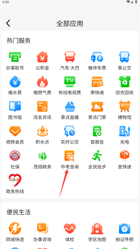 1、政务服务 包括办事取号、公积金查询、线上办事取号、入学报名等。 2、公共服务 涵盖缴水费、缴燃气费、缴停车费、话费充值、汽车大巴预订、图书馆服务、学区查询、就医查报告、寄快递、拍证件照、电影票购买、大牌点餐、视频会员特惠等。 3、生活服务 提供中考成绩查询、学位查询、生活消费折扣等服务。 4、12345热线 新增上线的12345政务服务便民热线具备诉求直达、知识搜索、查询或授权查询历史工单、满意度评价等功能。市民可以通过文字、图片和地图定位提交诉求,实时追踪诉求办理进度和处理结果,实现工单全流程可视化。茂名e生活APP怎么查中考成绩