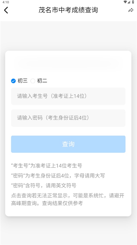 3、输入考生相关信息查询即可(支持初3/2学生成绩查询)。