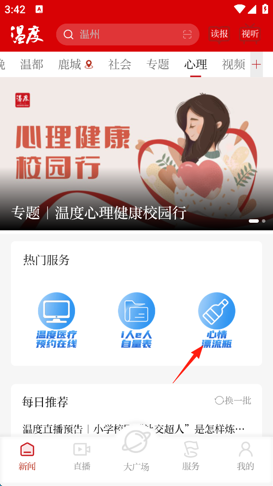1、新闻:点击切换任意频道,在线阅读新闻资讯。 2、直播:在线观看实时直播,播放直播回放视频。 3、理财:支持线上参与理财,购买任意理财产品。 4、报料:可以自由编辑信息,上传照片提交报料。温度新闻App如何捞/扔心情漂流瓶