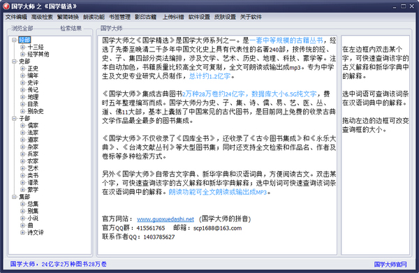国学精选电脑版是一款由国学大师出品的国学经典查询和释义软件,也是一套中等规模的古籍丛书,专为中学生及文史专业研究人员制作。其精选了先秦至晚清二千多年中国文化史上具有代表性的名著240部,并按传统的经、史、子、集四部分类法编排,涉及文学、艺术、历史、地理、科技、蒙学等。国学精选电脑版还支持检索功能,用户可以通过软件查询到我国两千年诸子百家的近乎所有存在的古书,全方位展示了华夏数千年的文化史,且软件自带释义,是文科生学习古文的好去处。有需求的朋友欢迎下载使用。