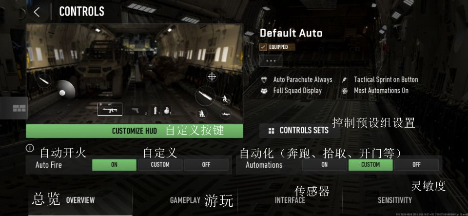 控制设置:自动开火、跳伞、按键和灵敏度等就在这里设置哦。