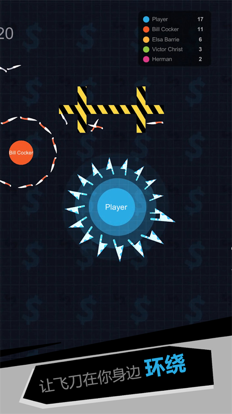 在游戏中我们将进入一个限制区域,通过收集散落的飞刀来增加自己的战斗力,然后与其他玩家进行碰撞,最终活下来即可获胜。