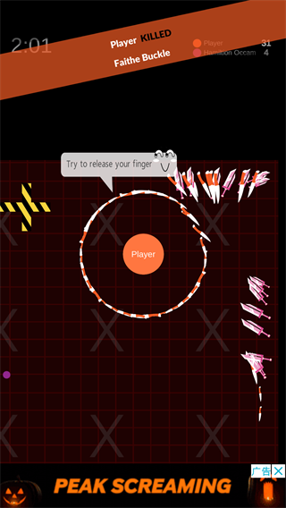 1、快速通关技巧 游戏的玩法比较简单,每一局都会有五名玩家,需要将其余四位玩家击败,这样你才能成为最终的获胜者,关于这款游戏的通关方法。 四杀通关技巧 在还没有发育强大之前,学会猥琐发育,找飞刀才是关键,遇见强大的敌人,赶紧进入防御状态,直接松开按着屏幕的手指即可,这样就能躲避敌人的攻击,另外还有一种方法,由于自身弱小的原因,可以躲在两个柱子之间或者是一些角落里,只要能隐藏身形即可,这都是保命的关键。 玩家不断的拾取新的飞刀,用飞刀来扩大自身的范围,这样能在游戏占据很大的优势,当自身的体积变得越来越大时,你不仅拥有自保的的能力,还能击杀其他玩家,让自己变得更加强大。尖刺破坏阵形是面对强敌时的最后一搏,被敌人包围,可以使用这个方法反败为胜,为了争夺第一名的位置,玩家们将要更加快速的操作圆圈移动,努力收集飞刀。