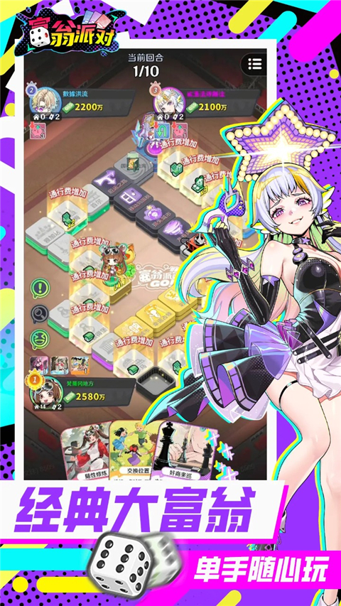 1、通过投掷骰子在棋盘上移动,触发各类事件与地块。 2、百余种功能卡牌,对局更具策略性。 3、多张风格迥异的地图场景,如盗梦空间、炸弹人等富翁派对手游如何开设好友房