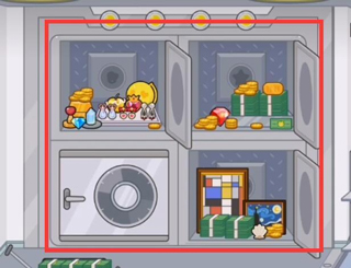 来到银行二楼,打开保险柜,根据图形找到钻石,红心,星星以及贝壳并依次放入,保险柜就会打开,里边有很多宝物。