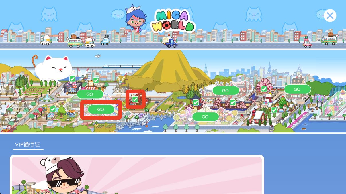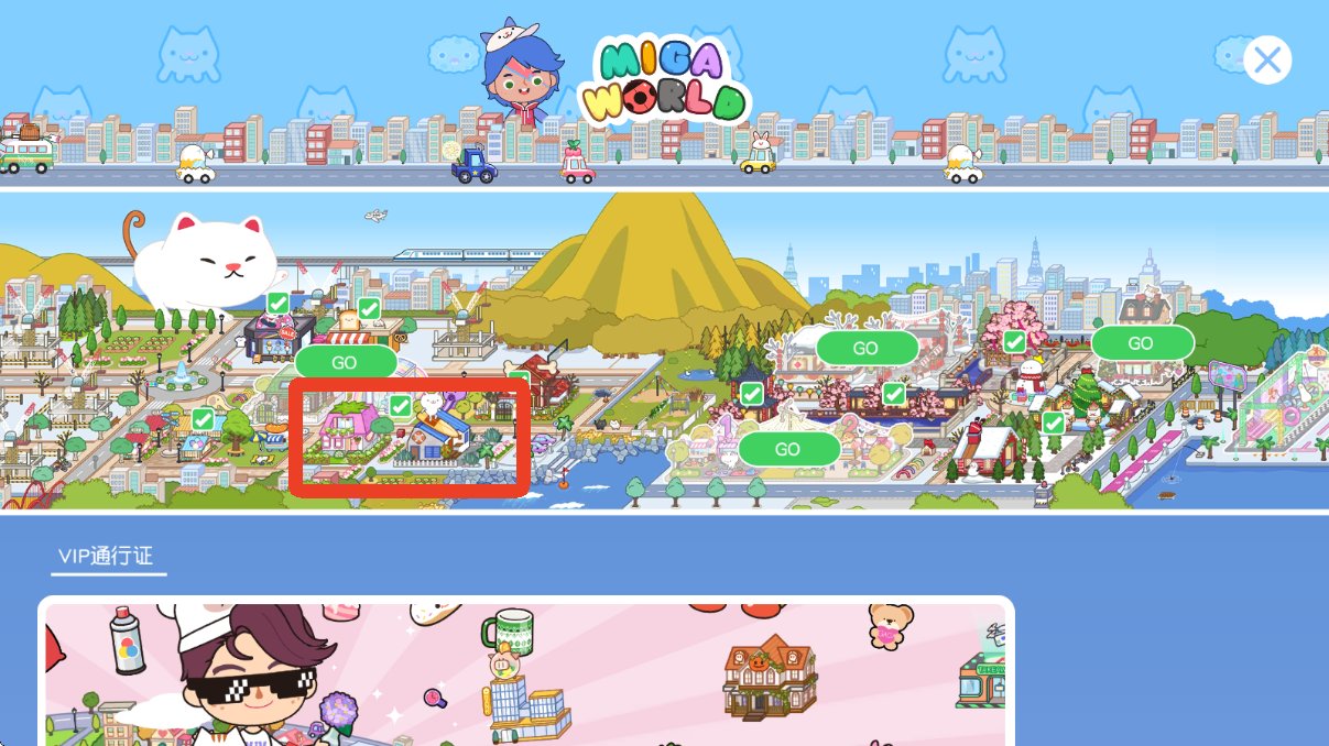 2、点开商城可以看到整个米加小镇的地图,建筑上方有绿色的√说明已经解锁了,找到你想解锁的地方,点击上面的GO字样。