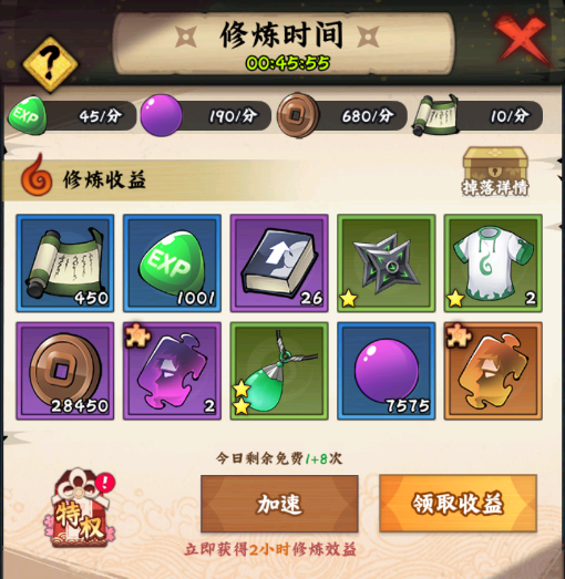 加速修炼:加速修炼可以快速获得经验,玩家首次加速可免费获得2小时收益,再次加速需要消耗忍币。每日最多可加速3次,每日0点更新次数。修炼时间达到上限后,不会在获得收益,因此玩家需要及时领取收益。