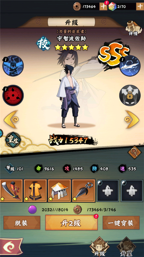 忍者升级/进阶:消耗经验丹和铜币可提升忍者等级,忍者达到一定等级后需要消耗进阶手札和铜币进阶后才能继续升级。