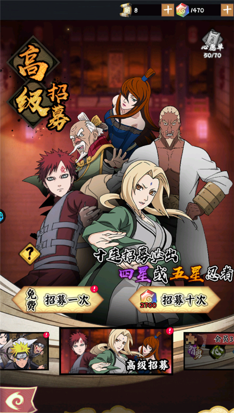 1、通过招募获得忍者:当前五星忍者等级分为:SSS+>SSS>SS>S,SSS+是当前最强力的忍者,因此在战力提升上首选凑齐6个SSS+忍者,如果短期内不好达成,则次要考虑SSS,SS或者S。
