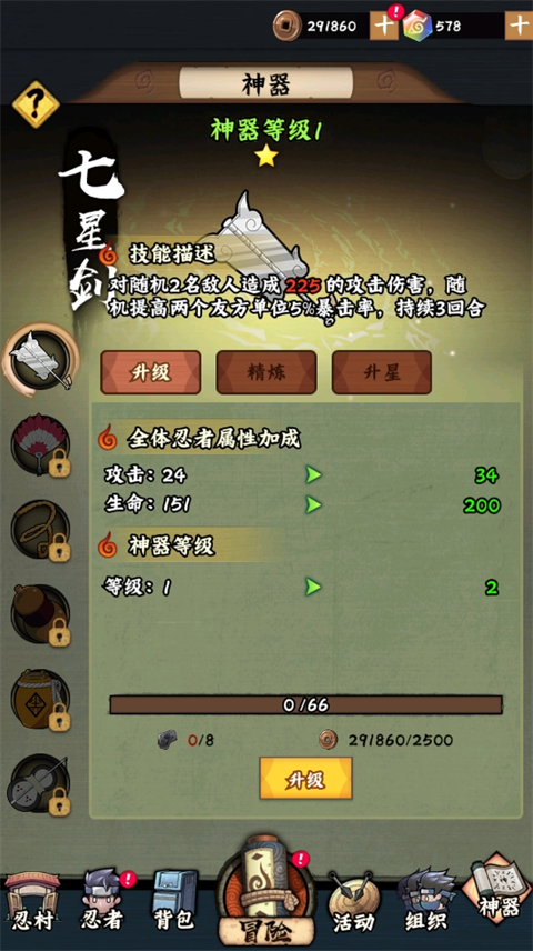 神器精炼:消耗精炼结晶和铜币可以精炼神器。精炼可以提供神器的技能伤害。精炼达到特定等级后,可以给全队忍者增加属性,提供不俗的战力加成。