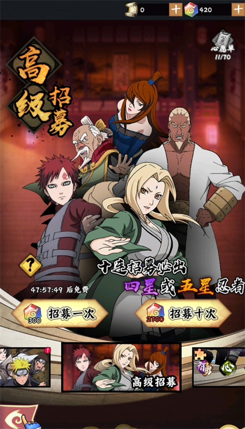 1、通过招募获得忍者:当前五星忍者等级分为:SSS>SS>S,SSS是当前最强力的忍者,因此在战力提升上首选凑齐6个SSS忍者,如果短期内不好达成,则次要考虑SS或者S,首日完成主要任务后,还是可以轻松获得6个S级的5星忍者。
