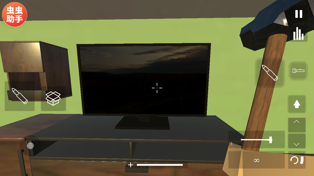 4、进入游戏,你会发现自己处在屋内,手里拿着锤子,不多说,先开锤,把这个电视机锤烂!