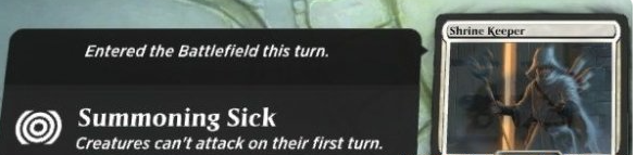如果没有敏捷异能,生物在刚召唤的回合处于召唤失调状态。你会看到卡牌图画上有眩晕的圈儿。直到你的下一个回合,你才能完全控制他,也就是可以横置他来产生特定作用。最基础的横置功能就是攻击。战斗阶段中,横置你的生物牌就可以宣告攻击。生物右下角的数字代表了它的攻击力/生命。