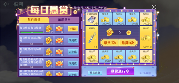 玩家完成每日/每周悬赏任务,可获取悬赏令以及悬赏战令经验,消耗悬赏令可以进行抽奖,获得指尖币奖励。