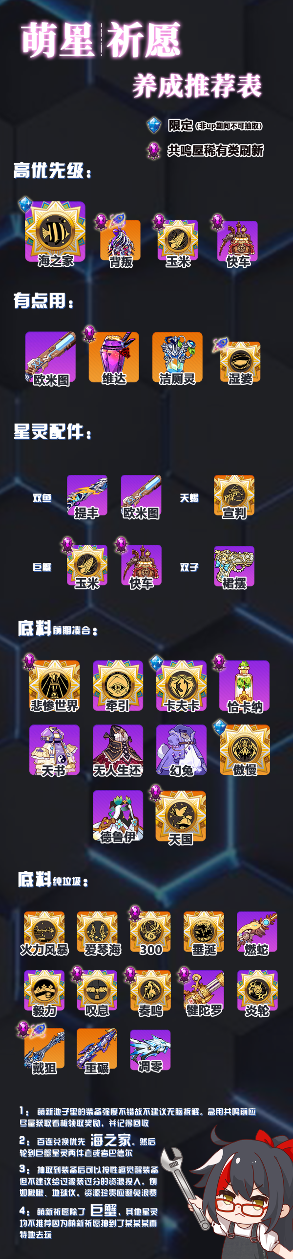 高优先级 装备可以作为抽取百连后的兑换主要方向,出海之家直接停手,200发除非真爱实在太亏 底料; 这类装备部分通用性还行,只是后期比较难跟主流的星灵搭配,不建议花费大量素材培养 另一部分就是纯下位,甚至不如一些地图装 有点用的装备主要体现在功能性上,前期过主线的时候有时可以逃课,或者后期偶偶尔尔能出来溜溜的,抽到算比较赚的一类 星灵配件这块主要得搭配星灵徽章,等萌新池子结束后可以根据星灵配件多与少来为自己的未来方向做规划,但萌新祈愿获得的装备不能决定星灵,而是你入坑时up抽到的相关星灵限定决定的
