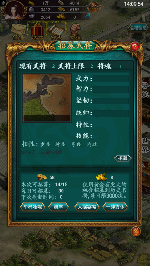 征讨天下,良将谋臣必不可少,三国名将为你所用。大摆筵席,招募三国名将入麾下,扩充自己的势力,为以后征战天下培养统帅的猛将贤臣。