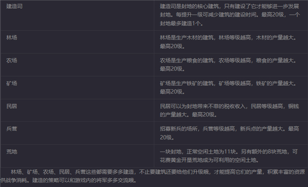 兵马未动,粮草先行,主公日后要征讨天下,资源尤为重要,资源可用来建设封地和招募士兵。封地内建设对应的建筑后就可以每时每刻生产出对应的资源了。