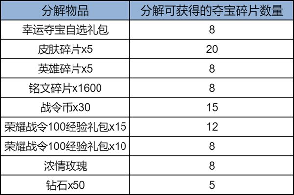6、夺宝碎片获取方法:通过夺宝抽取到幸运夺宝自选礼包、皮肤碎片、英雄碎片、铭文碎片、战令币、战令经验礼包、浓情玫瑰、钻石奖励都将进入夺宝盒,在夺宝盒中可选择将其领取或分解为夺宝碎片。