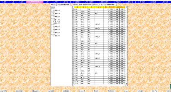 综合以上三种输入课时安排数据的方法,推荐的还是第1种办法:数据汇总法,这样容易输入和查错,只要求输入前面第1至第13个页面的数据后,最后到第14页面去点击按钮“汇总按钮”即可生成全部教师细课。