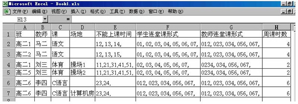 本系统能自动导入电子表格的类型XLS,方法:先调出电子表格软件EXCEL,如上编辑后,直接存盘即可,存盘文件名如:课时安排。xls,然后到排课系统的主菜单中选择“导入”,导入的类型选:电子表格XLS即可。