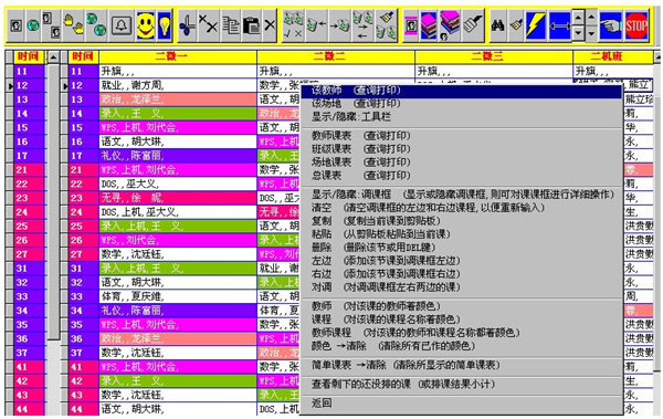 当运行了第二步中的排课程序生成了课表后,您还可对计算机已经排好的课表进行手动的调整某些课。为什么要手动调整呢?因为:1,计算机不是万能的机器,它也可能对您输入的课时安排数据没理解透彻,而排出了某些不符合要求的课。2,即使已完全按您输入的课时安排数据的要求排出了课表,但是,您若想对某个教师的课临时想调整到别的时间去上,只想临时改变(目的是:平时某几个教师之间互相调课,看对方的课是否符合调课要求。只是临时调整,以后也可调整回来)。基于以上二点,可以手动调整已排的课表。(调课界面如下:图中所示的不同颜色的课,是通过右键的快捷菜单的“着色”项来显示的,其目的是查看该教师或该课程在总课表中的分布情况。)