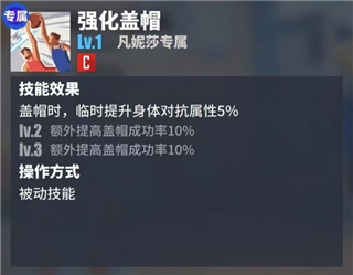 强化盖帽:盖帽时,临时提升身体对抗属性5%lv.2 额外提高盖帽成功率10%lv.3 额外提高盖帽成功率10%被动技能。这项被动技能可以在盖帽时临时提升凡妮莎的身体对抗属性,增加盖帽成功率,让对手球员在离篮不远的地方难以得分。