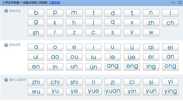 拼音点读机是一款专门针对幼儿、一年级小学生、学汉语拼音的外国友人等拼音初学者人群设计的可以点读的学拼音软件! 拼音点读机中的声母、韵母、整体认读音节均有标准发音,声母+韵母可自由组合出所有汉字的拼音,全部拼音均可拼读,并显示相应的常见汉字,便于学习,软件界面简洁,简单易用,是一款不错的有声点读拼音学习软件。为了满足不同人群需求, 拼音点读机现有电脑版和手机版两个版本自由选择,账号通用,不限制电脑和手机的台数,随时随地,想学就学。