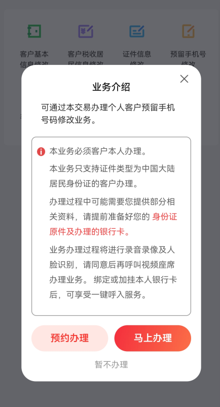 5、大家可以根据自己的时间选择预约办理或者马上办理,办理前需要提前准备好自己的身份证原件和银行卡哦。