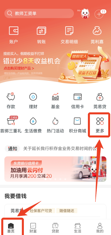 1、登录东莞银行APP后来到首页,点击【更多】选项。