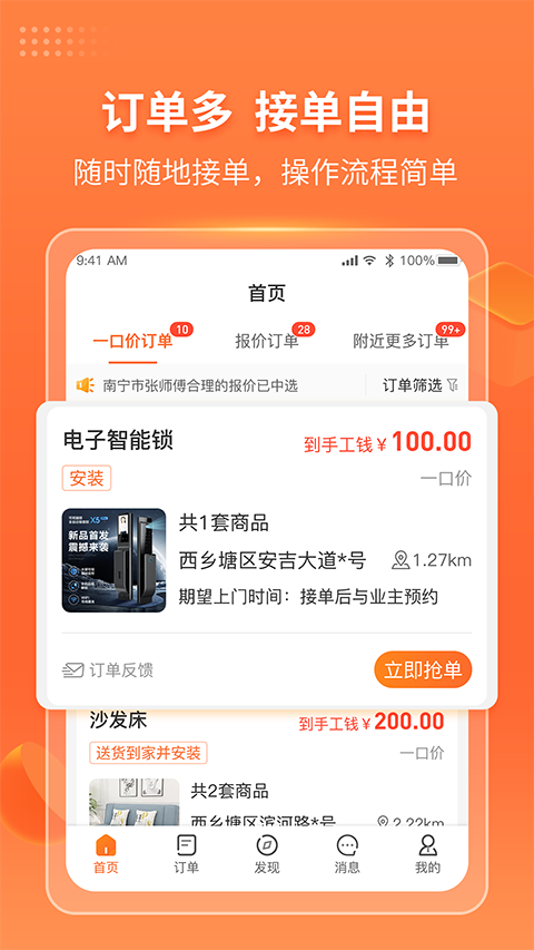 1、【实时接单】 订单多,可实时查看本地派单动态,接单更高效。 2、【订单管理】 随时查看订单,掌控订单动态,处理订单方便快捷。 3、【提高收入】 订单收入一目了然,结算快,随时可提现。 4、【免保证金】 免费注册,不收保证金,售后问题不罚款。工奇兵师傅接单平台App使用教程