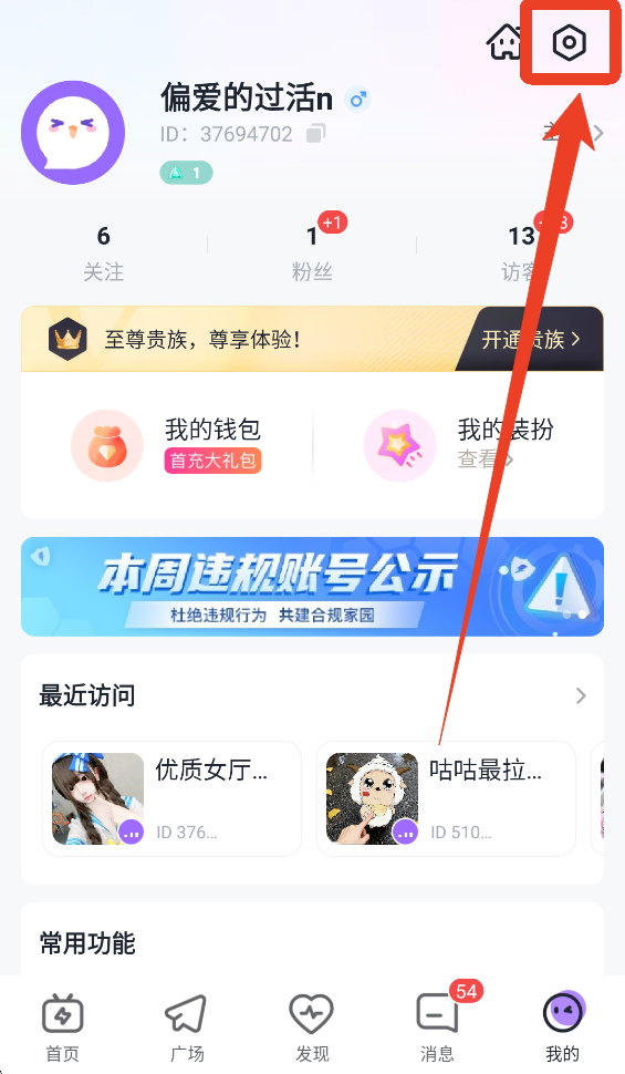 1、在【我的】页面点击右上角设置图标。