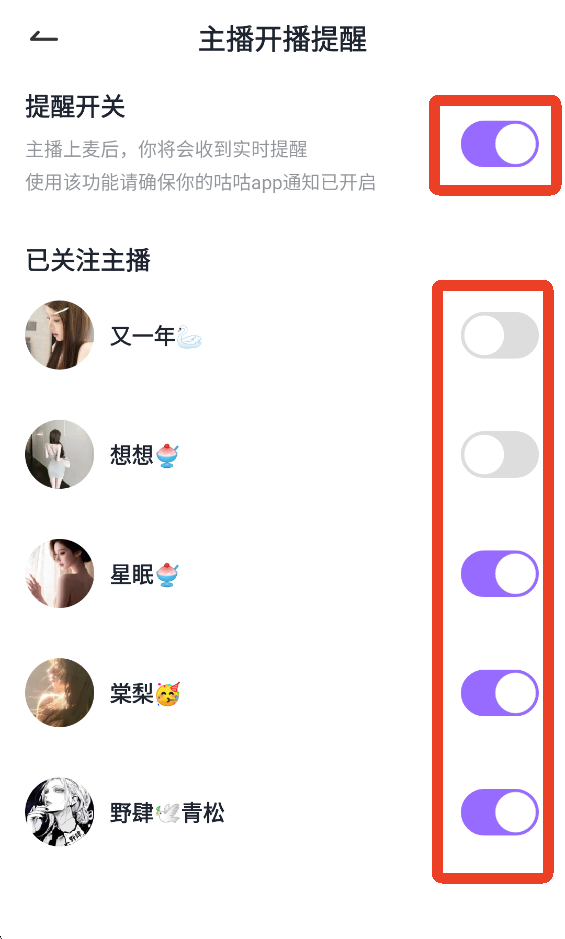 3、开启上面的【提醒开关】,开启后也能单独开启或关闭某个主播的开播提醒。