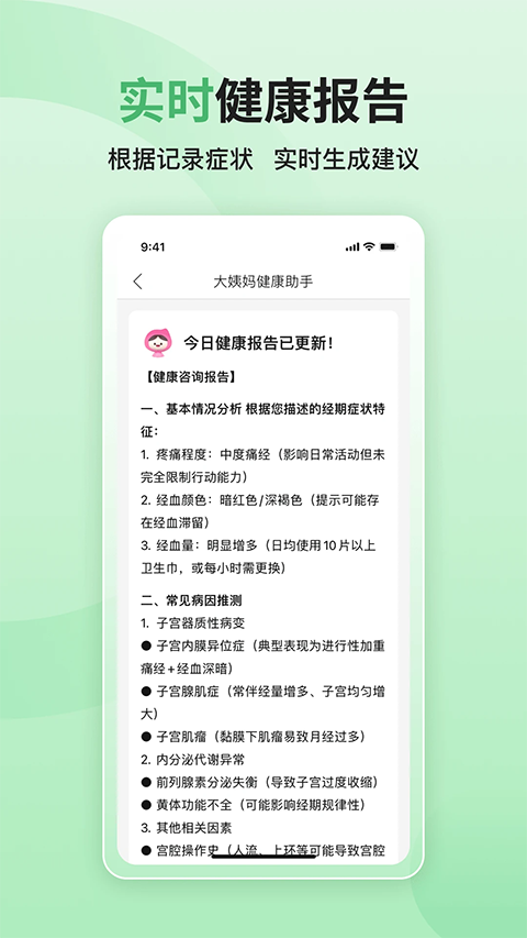 1、根据你的记录测算月经期、排卵期,让你从容应对,经期管理、备孕一键解决! 2、情侣共用大姨吗,让他第一时间获知你的周期/孕期症状,更好呵护你! 3、专业的经期预测,权威的经期孕期解答! 4、智能判断你的体质,推送专属于你的优质小贴士! 5、万千小组备孕妇科经期热火讨论中,玛芬都是你的贴心闺蜜! 6、数据在线同步,刷机、升级、换手机,不用担心经期或孕期数据丢失! 7、私家订阅每日宜忌,神婆一样准确!更有姨妈排名,酷到没朋友!主要功能