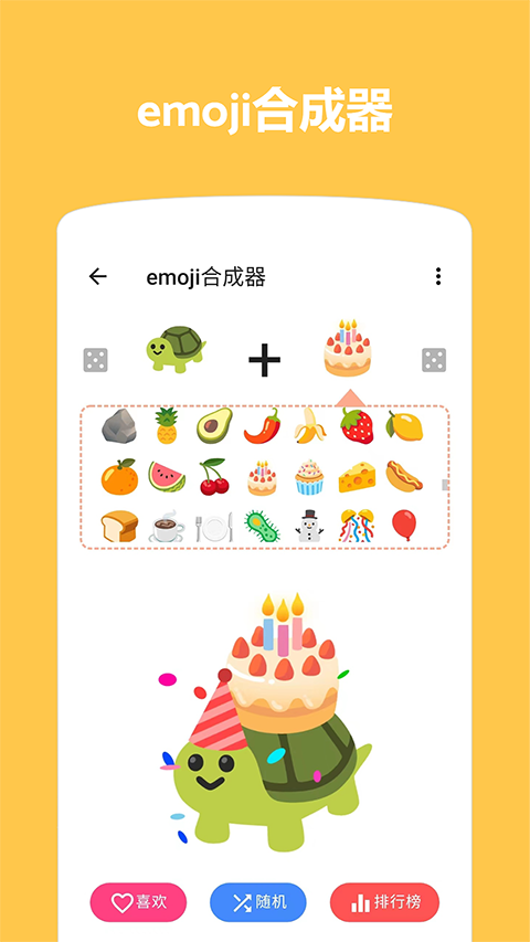 1、emoji制作 DIY个性emoji表情包,打造专属emoji表情包。将emoji表情元素拆分,再搭配组合新的emoji表情,支持生成高清大图和小图,一键作为表情分享到微信。 2、emoji合成器 两个emoji表情合成新的表情贴纸,支持随机组合。创意表情包生成器,emojimix合成器。 3、图片加emoji 内置海量emoji贴纸,多种emoji风格自由切换,支持自由组合emoji表情、自定义贴图、滤镜、涂鸦、添加文字。 4、表情包专辑 每日更新网络热门表情包、斗图表情、自制表情包、搞笑表情包、撩妹表情包、动态表情包、自拍表情包、表情包大乱斗、p图表情包等。Emoji表情贴图App图片emoji风格切换教程