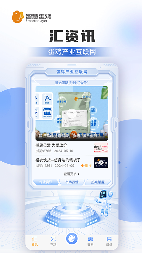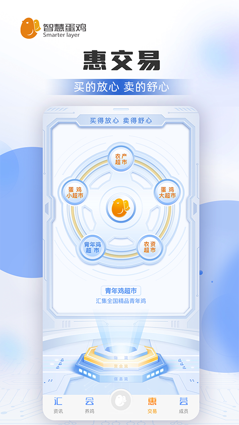 1、惠交易:买卖放心 钞票自然来 提供养鸡所有生产资料(雏鸡、饲料、药械)和鸡蛋、老母鸡的在线交易服务,产品“质量好、价格低、服务全、渠道广、物流快”,提高交易效率,实现“买得放心 卖得舒心 赚得开心”。 2、荟成员:养鸡人的专属朋友圈 打造有价值的开放平台,让养鸡人喜欢就加入、加入就分享、分享就收获。四大价值,拿什么爱你 我的智慧蛋鸡 3、监测海量数据,实现精准育种 通过对从育种研发到种鸡生产的全生命周期管理,实现年亿万级海量数据的收集、处理和遗传分析。 建立以大数据为基础、以客户需求为导向、以国内优秀育种素材为依托的精准育种方案,提高选育效率。 4、生产过程数据化,实现智慧养殖 通过精确追溯养殖场(户)鸡群的生产性能,实现对养殖场(户)鸡群投入品种、饲养等环节的数据化管理,并通过对海量技术数据的智能分析,为养殖场(户)在蛋鸡养殖过程中提供全程的技术指导。 5、金融保险有支撑,实现养殖无忧 智慧蛋鸡平台的建设,为养殖场(户)和金融保险机构搭建融资和保险桥梁,以平台中沉淀的大量数据资源作为担保依据,实现养殖场(户)贷款快、利息低,且投保易、赔付快,解决养殖户金融困惑、降低养殖风险,保障养殖场(户)的稳定收益。 6、产业共建共享,实现各方共赢 智慧蛋鸡服务平台,在建设过程中富集了生产物资供应商、养殖户、金融机构、保险公司、科研院所等资源。 在运行中会沉淀出三个数据库,即:种鸡数据库、蛋鸡数据库和产业数据库,通过对三个数据库进行提纯、分析,建立蛋鸡行业的大数据应用模式,反哺产业链各方。 这其中包括为生产物资供应商提供客源稳定的集销平台;为金融机构和保险公司的金融租赁业务和保险业务提供数据支撑,为基础研究和政策制定提供数据支撑,同时,通过分析消费需求,调整产品结构,提升产业链整体生产效率、降低生产成本。更新日志
