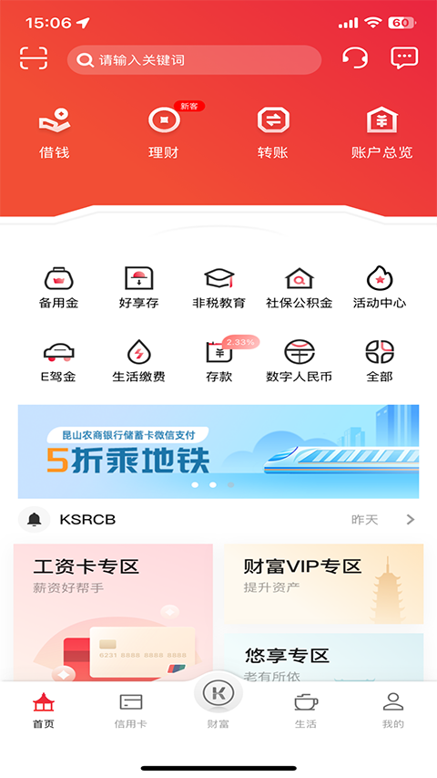1、大家打开昆山农商银行APP之后就可以看到首页的社保公积金了;