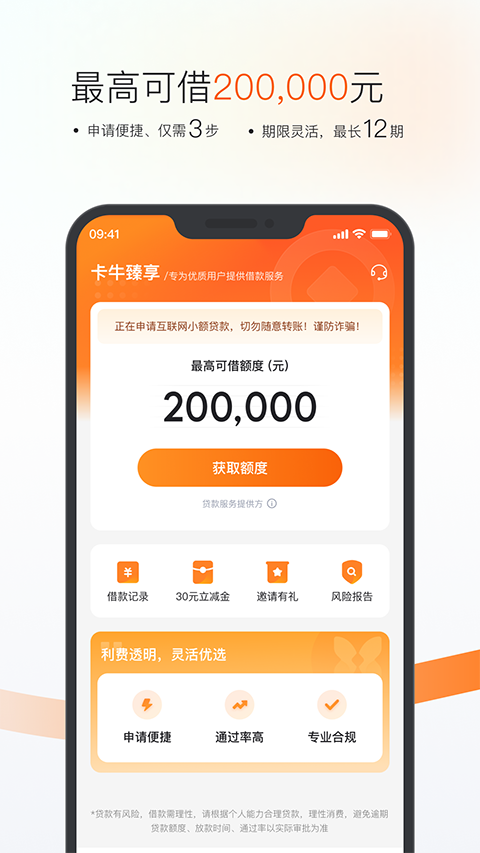卡牛臻享服务致力于通过金融科技手段,为广大有借贷需求的用户提供多种优质、快捷、安全的金融借款服务。 我们的优势特点: 1、额度高 个人贷款额度最高可达20万元,企业贷款额度最高可达300万元; 2、放款快 全在线自动化审批,最快5分钟即可到账; 3、息费透明 年化利率(单利)7.0%起; 4、资金方合规持牌 贷款服务提供方均为合法持牌机构,安全合规。更新日志