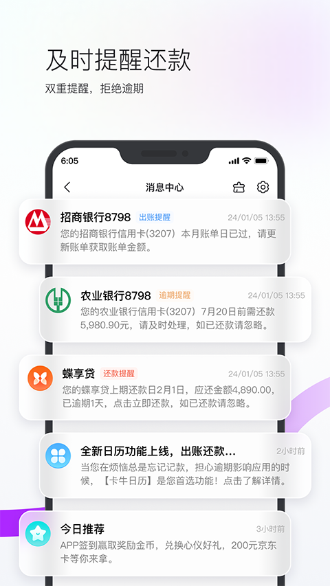 1、贴心的账单日历功能 账单日、还款日、还款金额、免息期等账单信息的日程管理,智能提醒避免逾期; 2、多种类账单管理 信用卡,网贷,房贷,车贷,水电费,燃气费,物业费,房租等各种账单一网打尽; 3、多机构账单管理 支持招商银行、工商银行、中国银行等127家银行账单的一键导入,支持100+贷款机构账单添加,轻松管理多张卡片;软件特点