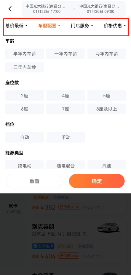 3、再根据需求选择车的配置、价格、服务和优惠等等;